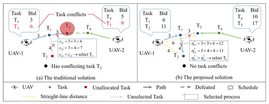 Then, the UAV can obtain consistent global task attribution information, and then it needs to adjust the original schedule based on this consistent information, mainly for task removal. At present, the two most representative algorithms, CBBA and PI, adopt different removal methods. CBBA removes all tasks after the outbid task, which is exploratory but also results in more task conflict. The PI removes the outbid task with the maximum difference, updates the bid of remaining tasks, and re-compares it with the task winner. The updated conflict task with a lower bid than the winner’s task is retained, which reduces exploration but also brings the disadvantage of insufficient optimization. Different from the traditional removal methods, this paper removes the outbid conflict tasks from the original schedule, which not only makes the task selection more exploratory but also ensures that the task attribution information is consistent with the conflict resolution.