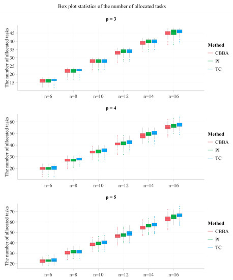 Figure 2 compares the task allocation number of the three methods, where it can be found that the method proposed in this paper allocates more tasks than the other two algorithms, enabling the UAV swarm to complete more tasks. When and , the median number of allocated tasks for the proposed method is 17, with an increment of 6% compared with CBBA and PI (both are 16). When and , the median number of allocated tasks with CBBA is 63, with PI is 65, and the with proposed method is 66, representing 5% and 2% increments over CBBA and PI, respectively. The reason why the proposed task consideration (TC) method can increase the number of allocated tasks is that the task consideration considers the regression of the task so that the UAV can complete as many of the tasks in its vicinity as possible. Furthermore, the proposed new removal method in the swarm consensus phase enables the UAV to explore more tasks in the task selection phase. The two jointly improve the optimization of the proposed algorithm.