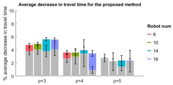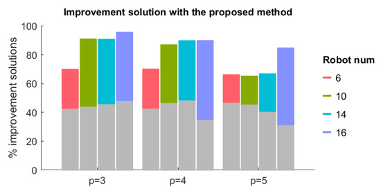 Figure 2 shows that the proposed method can complete more tasks than the other two methods, and naturally, its completion time will be longer. In order to objectively compare the optimization of methods in terms of the total travel time, the comparison of the total travel time of different methods should be carried out under the same number of task allocations. Figure 3 and Figure 4 respectively show the proportion and degree of reduction in the total travel time of swarm scheduling by the proposed method compared with the other two methods under the same number of task allocations, in which the color part is the comparison between the proposed method and CBBA method and the gray part is the comparison with the PI method. It can be seen that the proposed method has a certain degree of improvement compared with the other two algorithms under all different p and n. Compared with CBBA, the proposed method has the most improvement with 65–96% ameliorative solutions and a 2–6% average decrease in travel time. Compared with PI, the corresponding data are 31–48% and 1–4%, respectively. This effectively validates the optimization of the task consideration and task removal methods proposed in this paper, which balances the exploration and regression of tasks well.