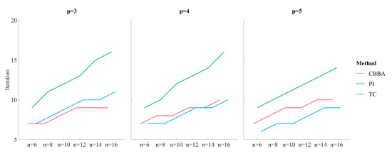Figure 5 shows the comparison of the three methods in terms of the number of iterations for various p and n. It can be found that the advantages of the proposed method are more obvious when p is larger. This is due to the regressive nature of the task consideration proposed in this paper, focusing on the exploration of tasks near the UAV and avoiding task conflicts with other UAVs caused by blind exploration, thereby reducing the number of iterations required for conflict resolution, which is especially obvious in the case of a large number of tasks per UAV. When p is small, the proposed method has a small increase compared to CBBA because it needs to update the consideration to improve the optimality, but it is still far less than the number of iterations required by PI.