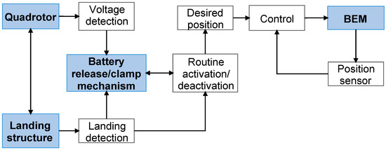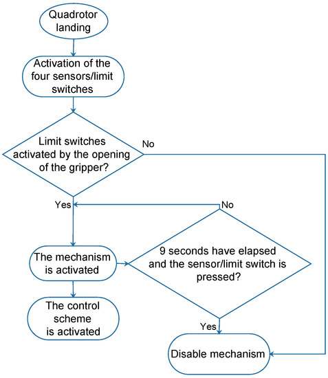 The proposed mechanism for connecting and disconnecting the battery consists of a gripper (see Figure 8) that releases the battery when the quadrotor is on the LS, and its battery has a voltage less than 13.5 V.