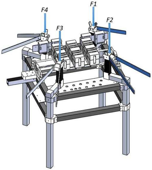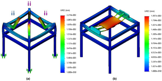 Finally, a finite element analysis simulation of the structure was conducted, giving priority to two vertical forces applied at different points: the first on the four arms that support the drone device (see Figure 7a), and the second on the mobile table that carries the interchangeable batteries. The force applied to each arm was 8.584 N, distributed over the transverse face of each of the hollow square profiles. On the movable table (BEM), the action of a force distributed (17.658 N) over the entire surface of the movable table was considered (see Figure 7b). Both analyses indicated that there were no deformations that could affect the battery exchange.