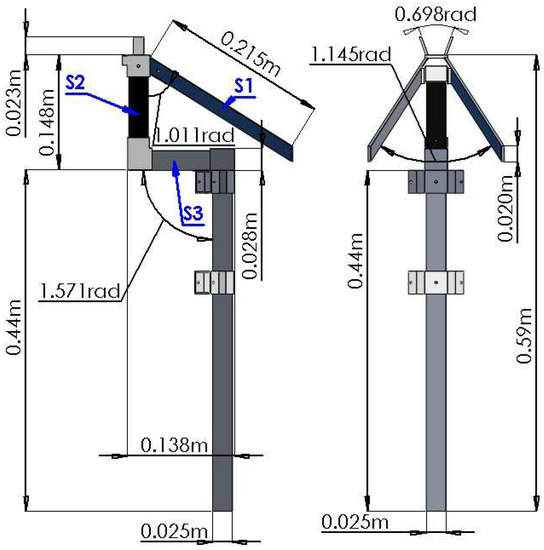 The service station was designed based on the requirements of the 3D Robotics quadrotor X4 Quad-C (marketed in 2014), which weighs 3.5 kg and uses a four-cell LiPo battery that delivers a voltage of V and a current of A. In addition, we assumed that the UAV has a control algorithm that compensates for the disturbances and aerodynamic effects present during landing. It is assumed that the UAV has the ability to land on the structure with a controlled descent speed and that the oscillations in () are limited to ±0.3 rad. The above conditions can be achieved by using control algorithms, such as those reported previously [4,28,29]. Based on the above, the design criteria for the prototype were as follows: