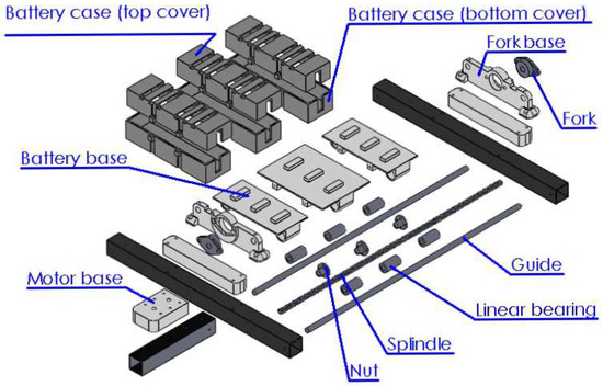 Considering the above-mentioned research, a need to develop systems that allow for the charging and exchanging of batteries in less time and at an affordable cost was observed. For example, in [2], the authors proposed a system that can charge various batteries; however, their system has inadequate dimensions for practical applications, and lacks a control scheme for the exchange. In [3], a system with only a mechanism for the exchange was presented, which has the disadvantage that the system requires one minute for the battery exchange.