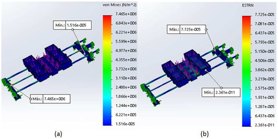 The results demonstrated a maximum stress and deformation of 7.465 MPa (see Figure 6a) and 0.00772% (see Figure 6b), respectively. Regarding the maximum deformation, the percentage obtained was negligible. A minimum safety factor of 23.09 was obtained, located at the connection of the spindle to the fork, allowing for the conclusion that the mechanism can support a maximum weight of 41.562 Kg. Finally, the maximum system displacement in the vertical axis is 0.05 mm, guaranteeing the absence of deviations that may affect or prevent the battery exchange.