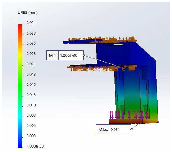 As mentioned above, the yield stress of the selected material was much greater than the maximum stress present; however, it is important to consider the maximum permissible vertical deformation. Therefore, a maximum allowable displacement of 0.5 mm was proposed in order to ensure the proper functioning of the exchange mechanism. Furthermore, a minimum safety factor of 38.57 was obtained, indicating that the structure can withstand a force of approximately 397.29 N, requiring 40.499 kg of weight to generate such a force.