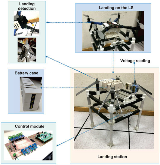 As mentioned in the previous section, the S-SERQ does not address the autonomous landing problem. Therefore, sensors and other components are used to enable/disable and control the exchange routine, which is independent of the landing algorithm used. The instrumentation used in the exchange station and quadrotor allows the system to know the status of the batteries and detect when the quadrotor is on the LS, providing the information required to perform the automatic battery exchange.