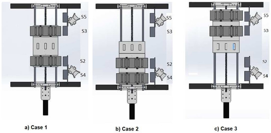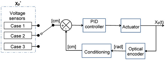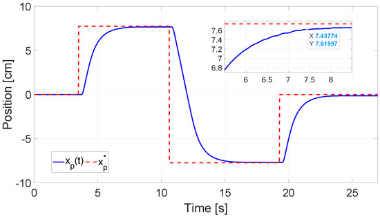 where , , , and the error is defined as the desired value minus the measured position value . After some tests, the gains used were , , and . Figure 18 depicts the response of the BEM once the control scheme described in Figure 14 is activated. The graph shows three cases (setpoints), the second being the maximum displacement required to place the battery further away in the center of the BEM. It is important to note that the battery change in case 2 can be completed in 6 s, while in cases 1 and 2, it requires 4 s. It should be highlighted that, in all cases, no oscillations or overshoots were observed in the position.