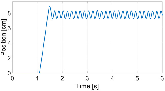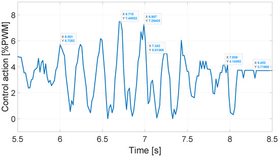 Figure 19 shows the control action exerted on the BEM once the quadrotor has landed on the LS and the control scheme has been activated (see Figure 14). Small oscillations can be observed, which do not affect the position of the mechanism. This is demonstrated by approaching the control action in the time interval of 5.5–8.5 s shown in Figure 20. Once the steady-state (setpoint) has been reached, the control action is bounded between 0 and , and has a frequency of approximately 25 rad/s. It should be noted that a PWM percentage larger than is required to move the motor. Furthermore, due to gear reduction, the peaks between 6 and cannot be perceived in the final position of the mechanism.