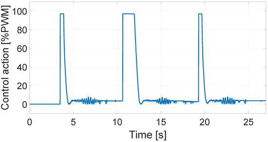 The critical gain () obtained was 200, resulting in 5.618 cycles per second , equivalent to a critical period () of 0.178 s. Therefore, using the Ziegler–Nichols procedure for a PID controller [40], the tuning parameters were , , and . Finally, the PID controller gains were obtained by evaluating the parameters , and in the following equation [41]: