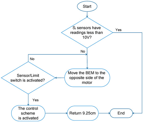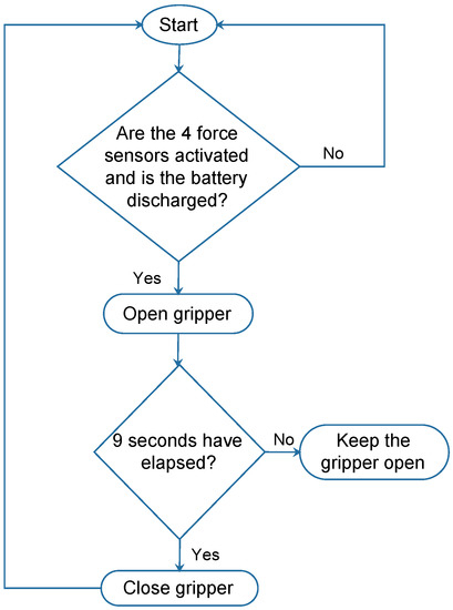 If the voltage sensor detects a value less than 13.5 V, a low voltage alarm is activated. However, if the force sensors do not detect that the vehicle is on the BEM, the gripper cannot be opened. To open it, the four force sensors must detect a weight greater than 500 g and the battery voltage must be less than 13.5 V. If these conditions are satisfied, the gripper opens for 9 s for battery release; then, it closes, thus placing the new battery (see Figure 22).