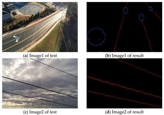 (1) From the perspective of detection accuracy, the UNet network has the highest detection accuracy among similar models, but still has poor segmentation of transmission lines in some complex scenes. As shown in Figure 3. Figure 3a shows the transmission line in the background of trees and houses. Figure 3c shows the segmentation experiment with the sky in the background. The experimental results show that there are obvious problems of incorrect segmentation and omitted segmentation in test Figure 3b (marked by the blue area in the figure). For simple background transmission, line segmentation presents better results, as shown in Figure 3d.