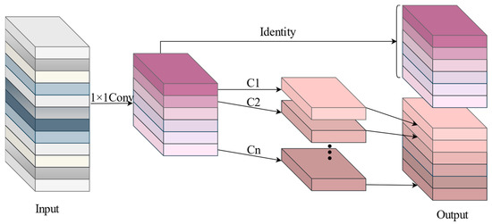 (1) The feature learning stage. The input features are projected by three 1 × 1 convolutions, and N feature fragments are reconstructed separately to obtain a rich intermediate feature set containing 3 × N feature maps to project features into a deeper space.
