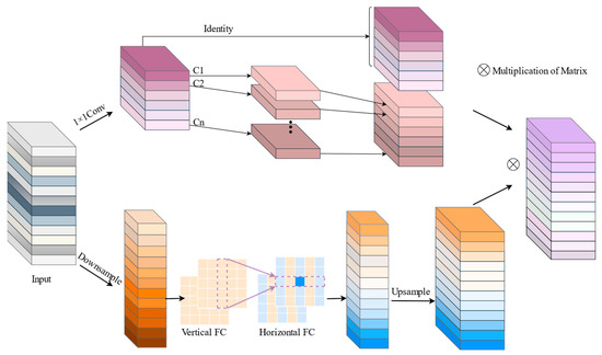In the study of attention mechanism, the channel-based attention mechanism can effectively explore the correlation between channels and at the same time adopt the fully connected way to combine the global feature map with the weight matrix, which can effectively enhance the weight of the target channels and suppress the proportion of invalid channels. The direct use of FC layers will bring about an increase in computation, so the design decomposes the original FC layers into feature extraction based on the horizontal and vertical directions so that the two FC layers model long-distance spatial information along their respective directions and finally combine the two FC layers to obtain the global perception field [38]. The structure is shown in Figure 5.