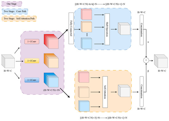 Finally, the final output Fout of ACmix is obtained by summing the outputs of the two-second stage pathways with additional learnable scalars α and β, as shown in Equation (14).