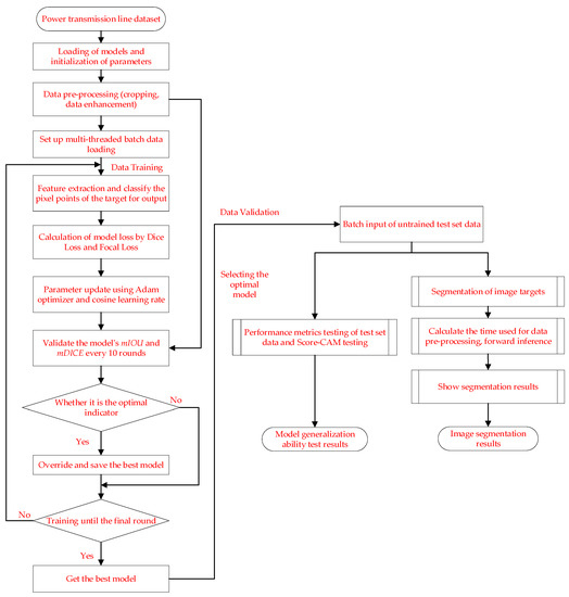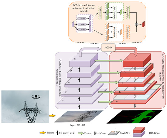 The detection methods for transmission lines can be divided into traditional image-processing methods and deep learning-based methods. Among the two methods for detecting transmission lines, traditional image-processing methods have been used for transmission line extraction based on edge detection algorithms. For example, Zhou et al. [1] proposed a color space variable-based classification and feature extraction method for transmission line images. It classifies images based on the relationship between the values of variables in each color space of the transmission line image and its corresponding image features, specifically focusing on different light intensities. Then, the edge extraction of power line images is performed by the OTSU (NobuyukiOtsumethod) algorithm [2]. This method mainly considers the power line segmentation under different lighting conditions; although the power lines are effectively extracted, the application scenario is mainly the power lines under low- to high-altitude photography. That is, the background is mainly the sky. When the perspective shifts from high altitude to low altitude shooting, the background is mostly houses, mountains, and rivers. As such, this type of algorithm cannot effectively solve the power line segmentation in complex backgrounds. Zhou et al. [3] took an improved Ratio operator [4] with horizontal orientation to extract power lines and then group and fit the power line segments. Since the experimental object of this literature is mainly for power line segmentation in horizontal distribution scenarios, it has a certain specificity. At the same time, the Ratio operator is susceptible to complex backgrounds with large variations in pixel gray values, especially for areas with relatively flat gray values, which are not as effective as the normal operator. Zhou et al. [5] perform transmission line segmentation in complex backgrounds by proposing a detection operator based on local contextual information. Compared with the literature 4 comprehensive optimization of power lines under a variety of angle changes, mainly considering the horizontal, vertical, and diagonal distribution of transmission lines, with a certain degree of algorithmic stability. Some studies are also based on Hough transform [6] for transmission line detection [7,8]. Shan et al. [9] design auxiliary devices for the segmentation of transmission lines and the method does not have a universal. In summary, since this type of algorithm does not introduce any prior knowledge and the algorithm model does not need to prepare a large number of samples for training in advance, it has the advantage of a low sample size requirement due to its less restrictive way of data collection. In addition, the power lines extracted using the Hough transform tend to lose the width information [10]. Both edge detection-based power line extraction algorithms and power line extraction algorithms with a priori knowledge share a common challenge: it is difficult to adaptively adjust the model parameters to maintain the good performance of the algorithm in the scenario-changing test data. All these methods use artificially defined shallow features in constructing power line extraction models.