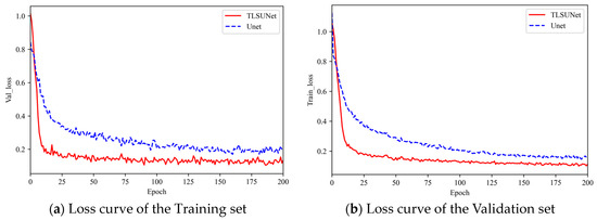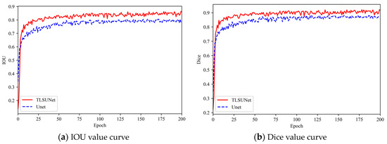 A comparison of the loss curves of the training and validation sets during the training process is shown in Figure 10. A total of 200 rounds were trained; the initial learning of the model was 0.0001, the momentum was 0.9, and the learning rate was optimized using cosine decay. The batch size was 4, and Iterative optimization of model parameters took place using Adam optimizer. Figure 10a shows the training loss convergence of the improved model and the original model. Figure 10b shows the validation loss convergence of the improved model and the original model. Among them, we will finally fuse all the improved models named TLSUNet (UNet + DFC-Ghost + ACmix + CARAFE), which is the red curve in Figure 10 and Figure 11. From the figure, it can be seen that the improved model has faster loss convergence and lower loss value than the original model, The model is smooth in the region around 150 rounds. Figure 11a,b show the validation set change curves of the mIOU and mDice metrics of the model before and after the improvement. As can be seen from the curves, the mIOU and mDice indexes of the improved model are higher than those of the original model, verifying the effectiveness of the model improvement.