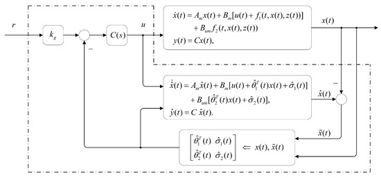 An adaptive controller consists of a state predictor, laws of adaptation, and a control law. In the context of differences in the laws of adaptation, adaptive control can be divided into adaptive control based on the Lyapunov stability theorem (-Ly) and control based on the piecewise constant laws of adaptation (-Pc). -Ly provides a convenient theoretical approach for the proof of stability and the analysis of control performance and has been subjected to greater research and generated more applications [14,15,16,17,18,19,20] than -Pc. However, minor changes in the parameters can result in significant changes in the performance of the -Ly controller, and this poses challenges in terms of adjusting its parameters. The -Pc controller is more suitable for engineering applications than the -Ly controller because it has fewer parameters and thus is easier to use. Further, this controller can achieve high adaptive speeds through improvements in the performance of the hardware. We thus investigate the -Pc controller here.