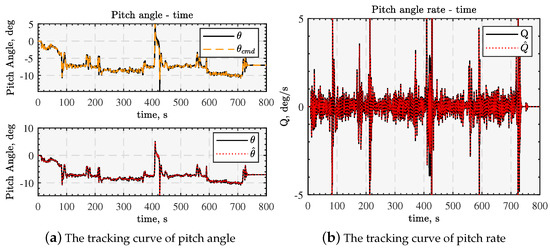 It is clear that the actual pitch angle accurately tracked its command well and that the estimated state vector accurately tracked its actual value. The 2-norm of pitch error in the simulation satisfied , which decreased by 30.7% compared with that of the actual flight. The mean squared error (MSE) of the pitch was 11.66, and the MSE of the pitch rate was 66.73.