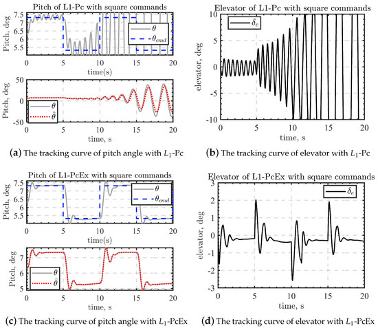 The convergence time of the pitch angle was less than 2 s for -PcEx, and no oscillation occurred. However, it was found that, under the same square wave command, the -Pc controller strongly diverges from 6 s onwards. After meticulous comparisons, we found that the controlled deviation of the -PcEx controller tends to be smaller than 0.1 degrees, which implies that -PcEx meets the accuracy requirements for engineering applications. Meanwhile, the peak time of the -PcEx controller was almost the same as that of the -Pc controller.