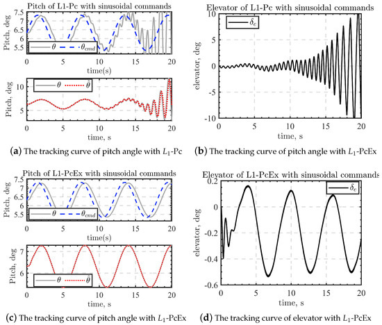 Figure 5 shows simulations performed that are similar to those in Figure 4, but with the pitch angle command replaced by a sine wave signal instead of a square wave signal. The purpose was to evaluate the controller’s adaptability and stability, as mentioned earlier. Therefore, the line styles and legends in Figure 5 are consistent with those described earlier and will not be repeated here. The conclusion is also similar: the -PcEx controller can adapt to the sinusoidal command within 2–3 s and maintain good tracking, while the -Pc controller exceeds the stability margin under the effect of uncertainty and begins to diverge significantly around 13 s. Numerically, the MSE of the pitch was 0.29 in -PcEx, while it was 53.62 in -Pc.