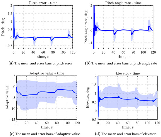 Figure 6a–d display the pitch error curve, pitch angle rate curve, adaptive value curve, and elevator curve over time. The solid blue line represents the mean value, and the light blue area represents the sample variance. Figure 6a shows that, although the variance of the error in pitch angle increased to 0.4 degrees when the UAV changed the flight phase and then decreased to less than 0.05 degrees in no more than 10 s, the variance of pitch reached its local minimum value at 43.4 s and decreased by 92.88% within 10 s. As shown in Figure 6b, we also observed an 89.96% reduction in the variance of the pitch rate within 10s. Because TECS gave a different command of pitch angle for each simulation, the adaptive value and the elevator readily stabilized at different values to ensure that the error in the pitch angle tended to zero. Therefore, as seen in Figure 6c,d, the means converged at different states over time while the sample variances remained large.