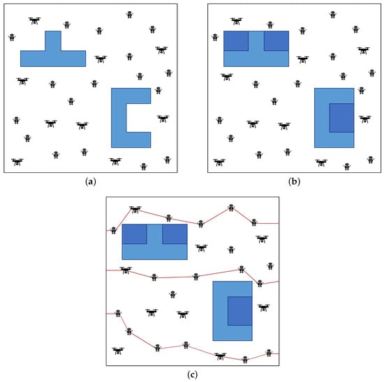 Figure 3 shows various situations that occur during the execution of Algorithm 1: Pre-Filled Convex Hull-Aware Construction. Figure 3a represents an initial state in which components are randomly arranged, and Figure 3b represents the square after filling in the missing parts of the obstacle. Figure 3c avoids obstacles and forms a barrier.