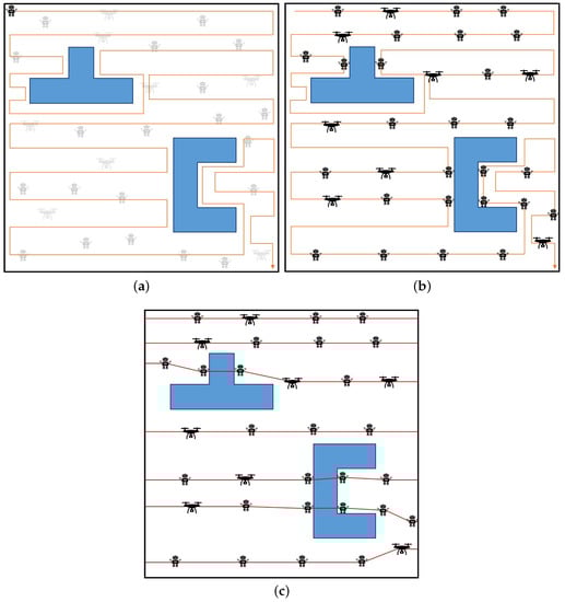 • After that, all the mobile robots and UAVs are rearranged on the drawn virtual path.