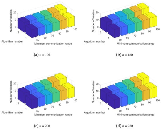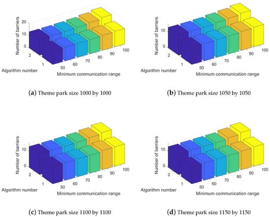 In regard to the second experimental scenario, the two approaches, Pre-Filled Convex Hull-Aware Construction and Pre-Drawn Virtual Lines Relocation, were executed for theme park sizes of  1000 × 1000 1050 × 150 1100 × 1100 1150 × 1150  with n = 100 and p = 2. As can be observed in Figure 6, there are three axes where the X-coordinate covers the minimum communication radius of a system member, and the Y-coordinate depicts the number of convex hull obstacle-aware tracking barriers for the two algorithms in the Z-coordinate, respectively. Figure 6a,b demonstrates the performance for the number of convex hull obstacle-aware tracking barriers when the two algorithms performed in a theme park sized  1000 × 1000  and  1050 × 1050 . Figure 6c,d compares Algorithms 1 and 2 implemented at  1100 × 1100  and  1150 × 1150 . According to Figure 6, the total number of convex hull obstacle-aware tracking barriers increased as the minimum communication radius increased for both approaches. Algorithm 2, Pre-Drawn Virtual Lines Relocation, outperformed Algorithm 1, Pre-Filled Convex Hull-Aware Construction for all applicable cases in the second group of experiments.