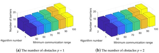 Lastly, for the fourth experimental scenario, the two schemes of Pre-Filled-Convex Hull-Aware-Construction and Pre-Drawn Virtual Lines Relocation, were used to solve the MaxConvexAwareTheme problem according to the different numbers of obstacles in the given areas. The number of convex hull obstacles p was set to 1, 2, 3, 4, respectively. To be consistent with previous scenarios, we also used three axes in the result graph. The X-coordinate presents the minimal communication range of the system component and the Y-coordinate depicts the total number of convex hull obstacle-aware tracking barriers completed by the proposed schemes in the Z-coordinate, with a total number of system components n = 100 and a given theme park area size of  1000 × 1000 , as shown in Figure 8. Then, Figure 8a,b represents the objective value of  ϑ  with the number of convex hull obstacles p = 1, 2. Figure 8c,d displays the obtained results from the two algorithms with a random interval of communication range = 3, 4. Based on the simulation results, seen in Figure 8, we demonstrated that the total number of convex hull obstacle-aware tracking barriers increased as the minimal communication or detection range increased when Pre-Filled Convex Hull-Aware Construction and Pre-Drawn Virtual Lines Relocation were executed in the scenario. Furthermore, Algorithm 2, Pre-Drawn Virtual Lines Relocation, performed better in convex hull obstacle-aware tracking barrier construction than Algorithm 1, Pre-Filled Convex Hull-Aware Construction, for each applied case in the fourth group of simulations.
