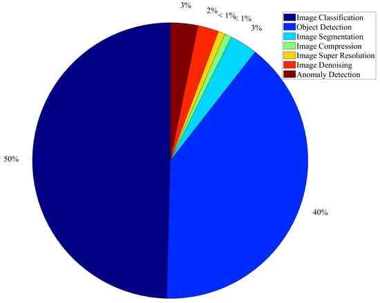 Figure 2 shows that the percentage of the application of ViTs for image classification, object detection, image segmentation, image compression, image super-resolution, image denoising, and anomaly detection is 50%, 40%, 3%, less than 1%, less than 1%, 2%, and 3% respectively.