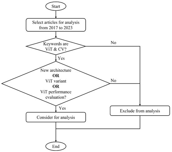| Require: Search on databases Ensure: Article from 2017 to 2023 while keyword—transformers in computer vision do if Discuss new architectures of ViTs | Evaluate performance of ViTs | Variants of ViTs then Consider for analysis else if Does not discuss ViTs architectures in vision then Exclude from the analysis end if end while  |