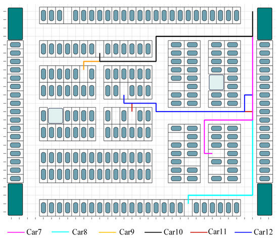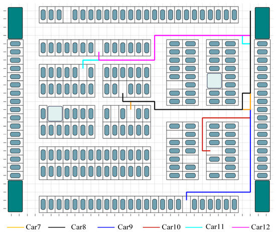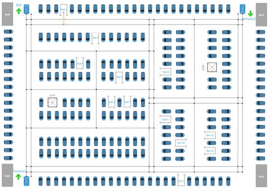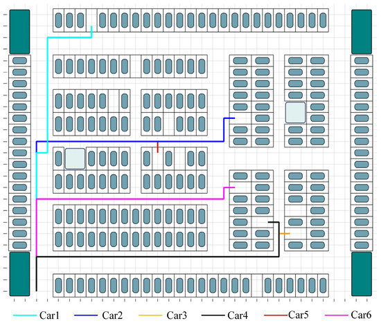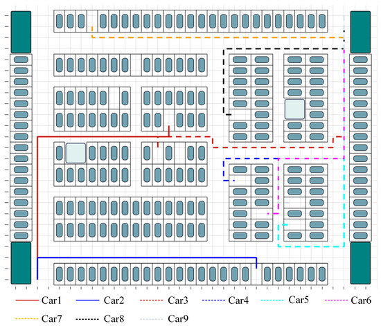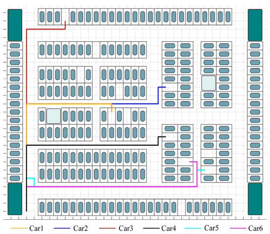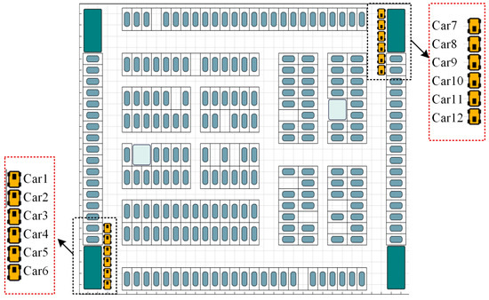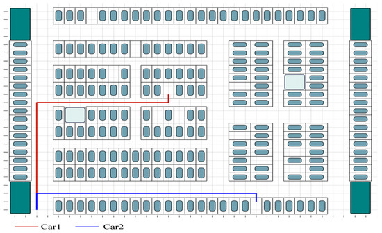 Figure 1 depicts a multi-entrance high-density parking lot, which contrasts with the conventional single-entrance parking lot and will be used as an example in this work. In single-entry parking lots, vehicles entering the lot are typically not inconvenienced by other vehicles; however, in multi-entry parking lots, conflicts such as confronting each other and overtaking are more likely to arise due to the diverse directions of vehicles.