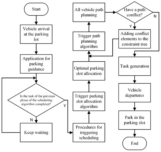 The architecture of the parking guidance system primarily consists of planning the optimal route and resolving conflicts between vehicles when parking. In Figure 2, the flow is demonstrated.