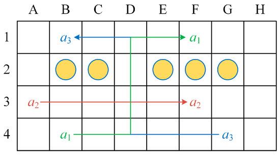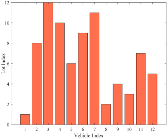 Building the scheduling model must take the time cost of the parking lot and the multi-intelligent vehicle system into account to ensure the efficient functioning of the parking system [31,32]. As a result, we created Equation (8) with the objective function of the shortest amount of time needed to finish every activity over the entire parking system-guided time period. Equation (9), where R is the total number of tasks, states that each legitimate task in the task list must be carried out. There can only be one vehicle allocated to each task, according to constraint (10). The safety of the multi-intelligent vehicle system’s operation is ensured by constraint (11), which guarantees the system’s collision-free motion, where C is the anticipated number of collisions when the vehicle completes the task. Equation (12) limits the number of vehicles that can park in a parking slot to only one. Equation (13) shows that neither the total number of allotted parking slots nor the total number of vehicles that must be parked exceeds the number of all legally available unoccupied spots in the parking lot. Constraint (14) assures that the amount of time needed for each vehicle to finish this work does not go beyond the amount of time in which the vehicle’s current power can finish it, represented by Er.
