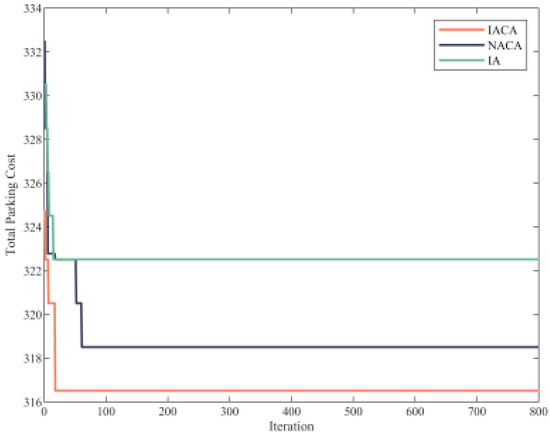 In order to handle the parking allocation problem in a large smart parking environment, Xie et al. [14] developed a collaborative strategy based on system-side deep reinforcement learning. In this paper, an improved ant colony algorithm combined with an immune algorithm (IACA–IA) is used as a solver to determine the ideal allocation model solution, which can take into account the best cost of the multi-intelligent vehicle system for the entire guided period of the parking system and the minimum time consumption of all tasks.