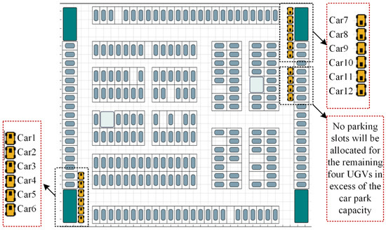 The overabundance of vehicle ownership has led to a shortage of parking slots, making the challenge to find parking a key hot topic in today’s urban traffic [1]. The majority of parking areas that are subterranean, have vast areas, more storage space, and space constraints, are found in large retail malls, hospitals, parks, etc., and have poor security management [2,3]. There is a problem of prolonged queues and even deadlock for the vehicles that need to be parked. The current parking system generally reports the number of available slots, but is unable to pinpoint their exact position or rationally distribute parking slots or map out travel routes for vehicles. Vehicles may seek parking slots repeatedly if several vehicles attempt to park in the same slot. This causes congestion and has an emotional impact on drivers [4]. Therefore, we systematically take into account the traffic congestion that the multi-UGV-based parking system faces, and we make decisions starting from the selection of parking slots for vehicles, the best driving path, and then conflict resolution of multiple vehicles, starting as soon as the vehicles arrive at the entrance of the parking lot. This paper aims to provide each vehicle with a reasonable and efficient planning solution to fundamentally improve urban mobility and release urban traffic congestion.