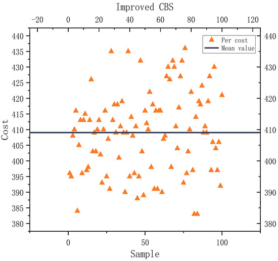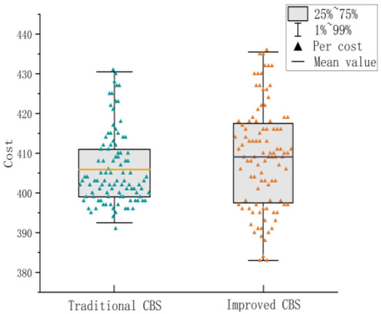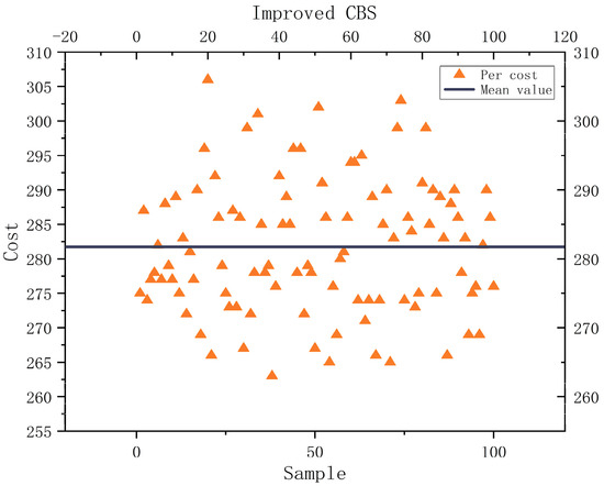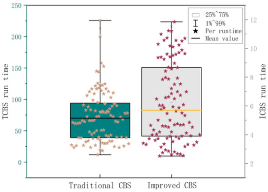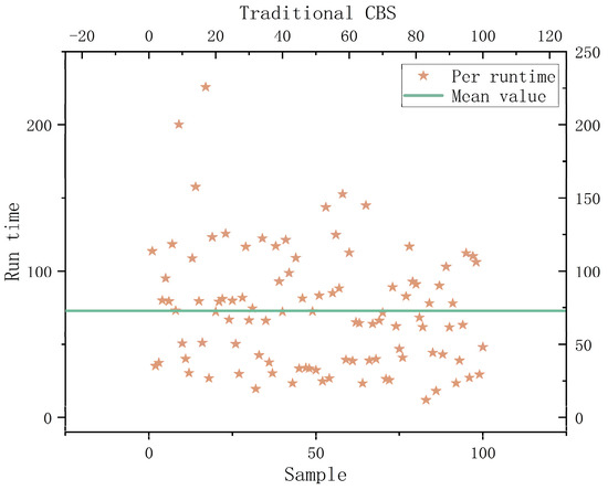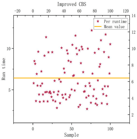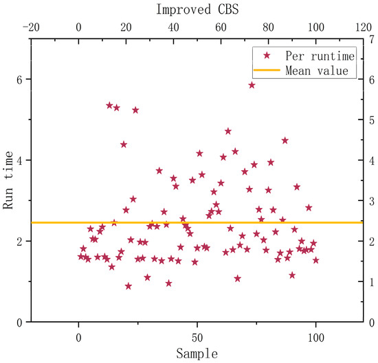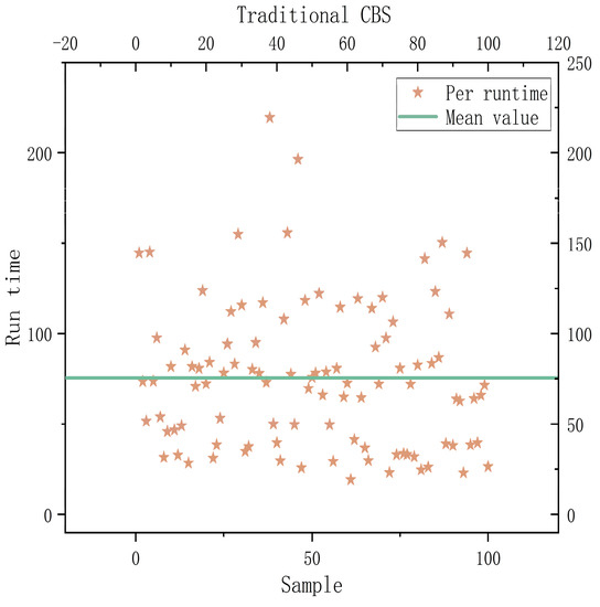 An improved CBS (ECBS) algorithm that can identify disputes online was developed based on the study [26]. It included the CBS (Explicit Estimation CBS, EECBS) algorithm, which combines the explicit estimation approach to predict the extension of the upper constraint tree by learning online. Li et al. [27] increased the algorithm’s success rate in locating the best solution. However, the algorithm’s performance was enhanced without taking into account its enormous computational volume and lengthy solution time. In this study, we propose a dual-objective expansion model of the CBS upper-level algorithm based on the constraint tree nodes, which resolves the incompatibility between both the algorithm’s high performance and low computational effort and overcomes the instability of the single-objective model solution.
