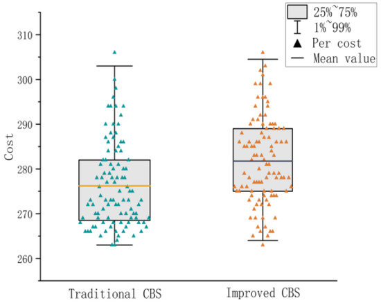 The simulation experiments show that although both algorithms can solve the planning results under the parking Scenario 3, the total cost and total energy consumption of vehicles planned by ICBS are 97.44–101.73% of that of TCBS algorithm in terms of algorithm performance. In terms of algorithm computation, ICBS reduces the solution time by 91.48%, the number of conflict points by 10.01%, and the number of constraint tree nodes by 21.45% compared to the TCBS algorithm. Significant benefits were realized in the test by the improved method. Although ICBS did not considerably lower the cost of the multi-intelligent vehicle system, as shown in Figure 41, it can discover a better planning solution that TCBS cannot solve and reduce the number of conflict sites, which is adequate to ensure the vehicle’s safety. When the surroundings are complicated, TCBS takes a lot of time. Due to ADA* and a bi-objective extension model that simultaneously optimizes the upper and lower algorithms, ICBS significantly increases planning effectiveness. As a result, the proposed method in this paper takes less time for planning and improves node redundancy. The aim of simplifying the computational complexity and promoting planning efficiency is achieved with essentially the same total cost.
