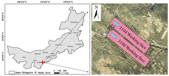 The research area is located in a coalmine in Ordos City, Inner Mongolia Autonomous Region. The area includes two adjacent mining faces, 3104 and 3106. The inclination length of 3104 and 3106 is 300 m; the strike lengths are 1362 m and 1552 m, respectively; and the width of the interval coal pillar of the working face is 30 m. The mining durations for both mining faces of 3104 and 3106 are from March 2018 to October 2018 and from November 2018 to May 2019, respectively. The position and advancing direction of the working face are shown in Figure 1. The working face belongs to 3–1 # coal seam, with an average mining thickness of 5.2 m. The coal seam dip angle is 2°, which belongs to a near-horizontal coal seam, and the mining depth is about 420 m. The roof is managed using the whole caving method, and the lithology of the overlying strata is medium hard. The surface vegetation of the working face is sparse, mostly low shrubs, with a small number of buildings, but with no large lakes and rivers.