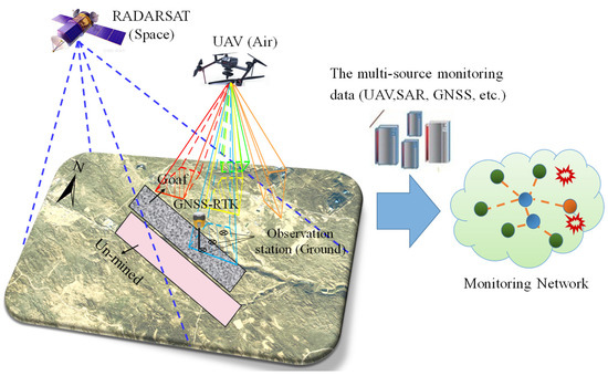 As an essential source of coal resources in China, coal mining in the western mining area has caused serious geological and environmental damage problems while meeting energy demands. Especially in recent years, with the rapid development of coal mining technology, large-scale, rapid, and high-intensity mining has become the norm. The mining area is mostly characterized by the continuous mining of multiple large-size (generally 150 m–400 m) adjacent working faces. The law of overlying strata and surface movement caused by mining is more complex than that of a single working face. Moreover, the surface movement and deformation show the characteristics of fast subsidence, large deformation, and wide influence range, which also brings specific difficulties and various challenges to the surface monitoring [1].