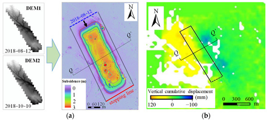 Subsidence basin solved using InSAR and UAV. (a) UAV solution of subsidence basin; (b) InSAR UAV solution of subsidence basin.