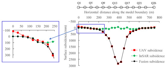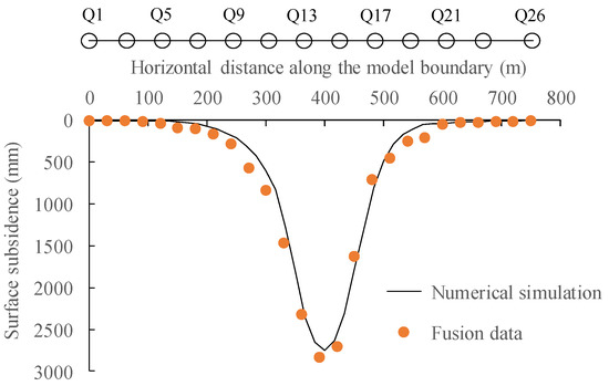 Therefore, the observation thresholds of UAV and InSAR are determined as 104 mm and 457 mm, respectively. For that reason, the InSAR observation data were used for Q7 points, and before, Q21, and after, the UAV observation data were selected between Q10 and Q18, and the remaining points were supplemented using the probability integral method fitting interpolation, as shown in Figure 4. It should be noted that the fusion results can lay a foundation for the determination of the physical and mechanical parameters of the overlying strata using discrete element simulations.