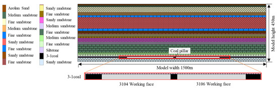 Universal Distinct Element Code (UDEC) is a two-dimensional discrete element numerical simulation software developed by Itsac for discontinuous media. Its basic principle is based on Newton’s second law and stress–displacement action law to simulate discontinuous media’s stress and motion state under dynamic and static loads. UDEC software allows for large deformation of discrete blocks, which can slide, rotate, and fall off along discontinuous joint surfaces. It has become a vital calculation tool within the domain of mining subsidence research [36]. Due to its efficiency and wide use, UDEC software was selected for the discrete element numerical simulations in this paper. The geological and mining conditions in the study area were taken as the prototype. According to the distribution of the rock strata exposed by the mine boreholes, the model was simplified appropriately. We assumed that the model size is 1500 m × 450 m. The discrete unit block was divided into 18,550 units according to the actual development and distribution of the rock strata. The model contains two adjacent mining units of the 3104 and 3106 working faces, as shown in Figure 5. In the model, the strain softening model was used to describe the mechanical properties of the coal body, the Mohr–Coulomb model was used as the yield failure criterion of coal rock mass, and the Coulomb sliding model of surface contact was selected as the joint. The upper boundary of the model is a free surface, the left and right boundaries limit the horizontal displacement, the lower boundary limits the horizontal and vertical displacement, and the initial stress field is the self-weight stress of the rock stratum. When the maximum unbalanced force was about 0.01% of the initial unbalanced force, then the model calculation was considered completed.