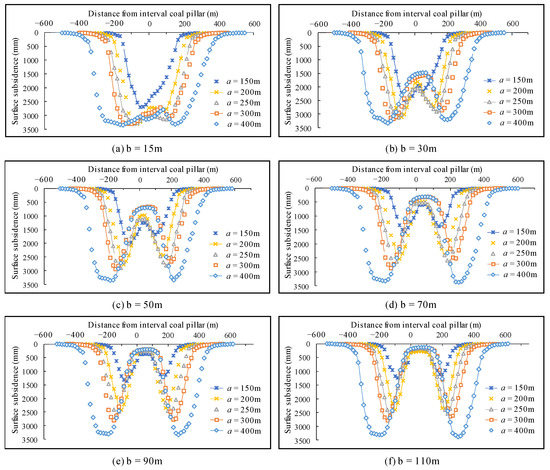 Under the condition of different interval coal pillar widths, the working face mining width changed, and the surface subsidence was calculated using discrete element simulation software. In order to facilitate analysis and expression, the left boundary of the interval coal pillar was used as the coordinate origin of the horizontal axis. The width of the working face is represented by a, and the width of the coal pillar is represented by b, as shown in Figure 7.