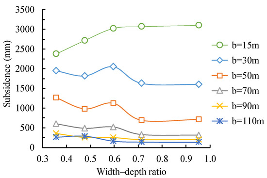 Surface subsidence value above the coal pillar under different width–depth ratios of adjacent mining.