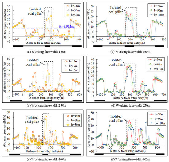 When the width of the working face is 400 m (a single working face is sufficient mining), in, this situation, there are many stress concentration phenomena above the mining area and interval coal pillar after adjacent mining. Overall, the greater the width of the interval coal pillar, the smaller the peak stress at the coal pillar and vice versa. When the width of the interval coal pillar is 15 m, the coal pillar is a failure, and there are many stress concentrations in the goaf. When the width of the interval coal pillar is 30 m, 50 m, and 70 m, then the stress of the coal pillar is a “single hump”, and the peak stresses are 47.6 Mpa, 52.2 Mpa, and 34.2 Mpa, respectively. Furthermore, the stress concentration factors are 5.3, 5.8, and 3.8, respectively. Finally, when the interval coal pillar is 90 m and 110 m, then the stress of the coal pillar is a “double hump”, and the peak stresses are (30.0 Mpa, 30.9 Mpa) and (26.6 Mpa, 27.1 Mpa), respectively.