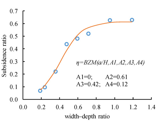 where η is the surface subsidence ratio; a is the width of the working face; and H is the mining depth of working face. The width-to-depth ratio is positively correlated with the subsidence ratio. With the increase in the width-to-depth ratio, the surface subsidence first increases rapidly, then increase slowly, and finally reaches the maximum value. When the width–depth ratio is greater than 0.42, then the subsidence rate increases slowly with the increase in the width–depth ratio. When the width–depth ratio is less than 0.42, then the subsidence ratio increases rapidly.