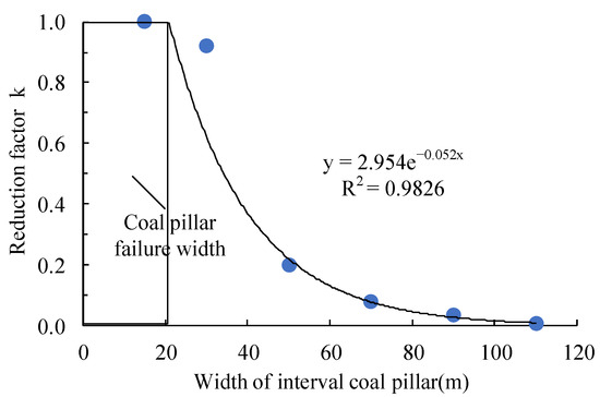 The maximum subsidence increment of the adjacent mining surface reflects the disturbance degree of the adjacent working face. The maximum surface subsidence value after adjacent mining is brought into Formula (3), the equivalent mining width a′ is inversely deduced, and the reduction coefficient k under the condition of each interval coal pillar width is fitted, as shown in Figure 11.