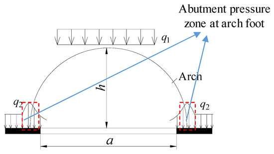 The overburden structure of a working face mining mainly includes two scales: arch and beam. The pressure arch belongs to the whole structure, which plays a macro supporting role in the whole overlying strata. The key stratum existing in the overlying strata belongs to the stratum structure, which controls the movement of the soft rock and surface in the upper part of the stratum [21,22,29]. According to the theory of pressure arch, the high-stress trace of mining overburden is arched; the arch foot shows obvious stress concentration, as shown in Figure 12; and the maximum vertical stress at the arch foot is generally greater than 1.5 times the original rock stress [1,39]. The main key stratum controls surface movement, and its structural characteristics are directly related to the surface subsidence characteristics. Therefore, based on the “arch–beam” theory, combined with the distribution of mining area stress and surface subsidence, this paper analyzes the evolution law of overlying strata structure in the stope.